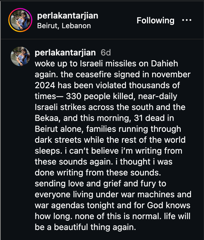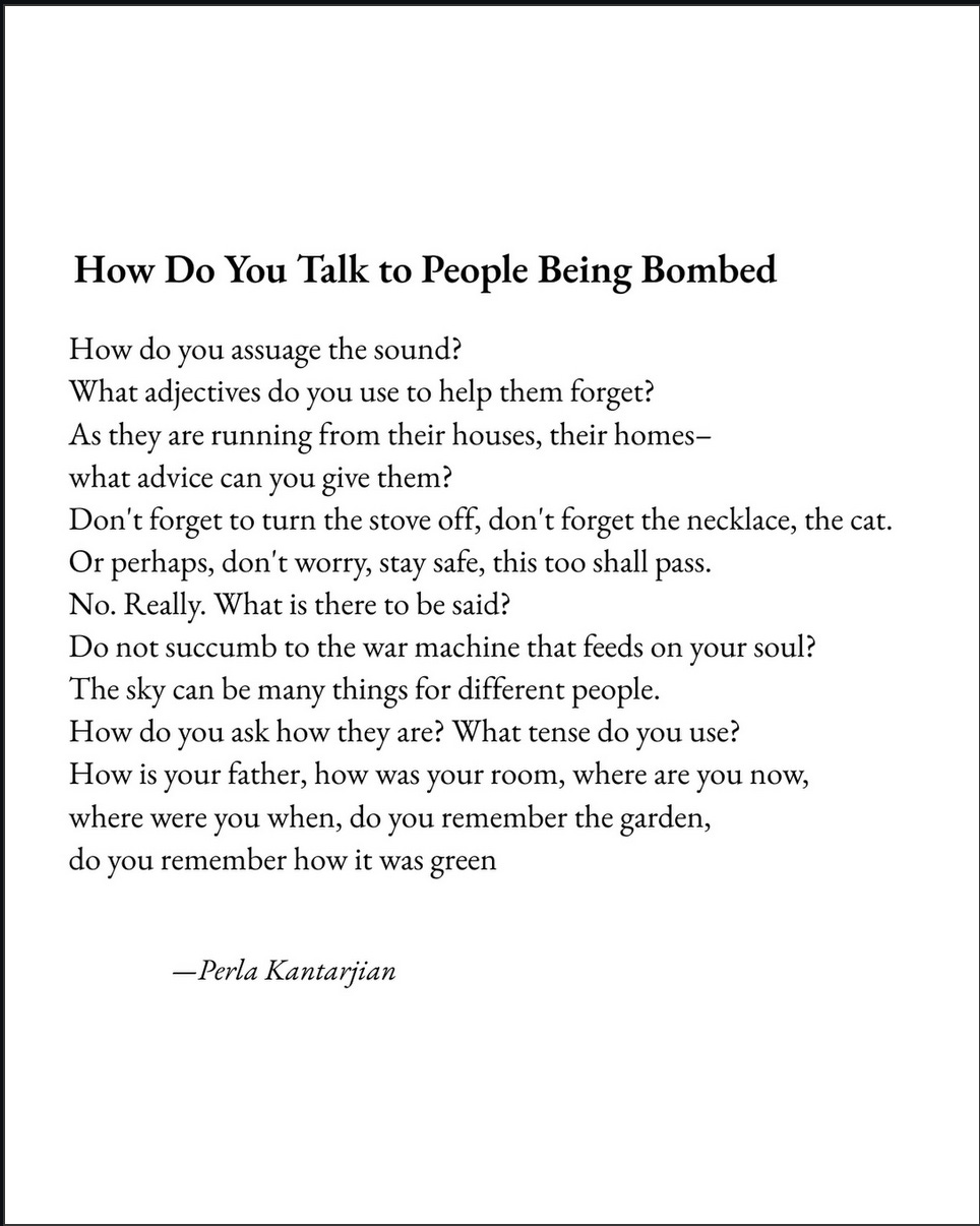 I wanted to start this newsletter with this beautiful poem by Lebanese-Armenian Poet Perla Kantarjian, because when I first started trying to write this, I had no words.